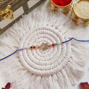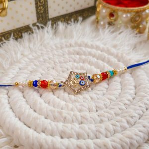 This Beautiful Brass Rakhi features an evil eye charm studded with a.ds in the matte gold finish, accented by glass beads.