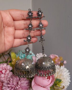 Tags: light weight jhumka, Long Ardra Stonework Jhumka Earrings, long jhumka, Matt Black, matt black jhumka, White